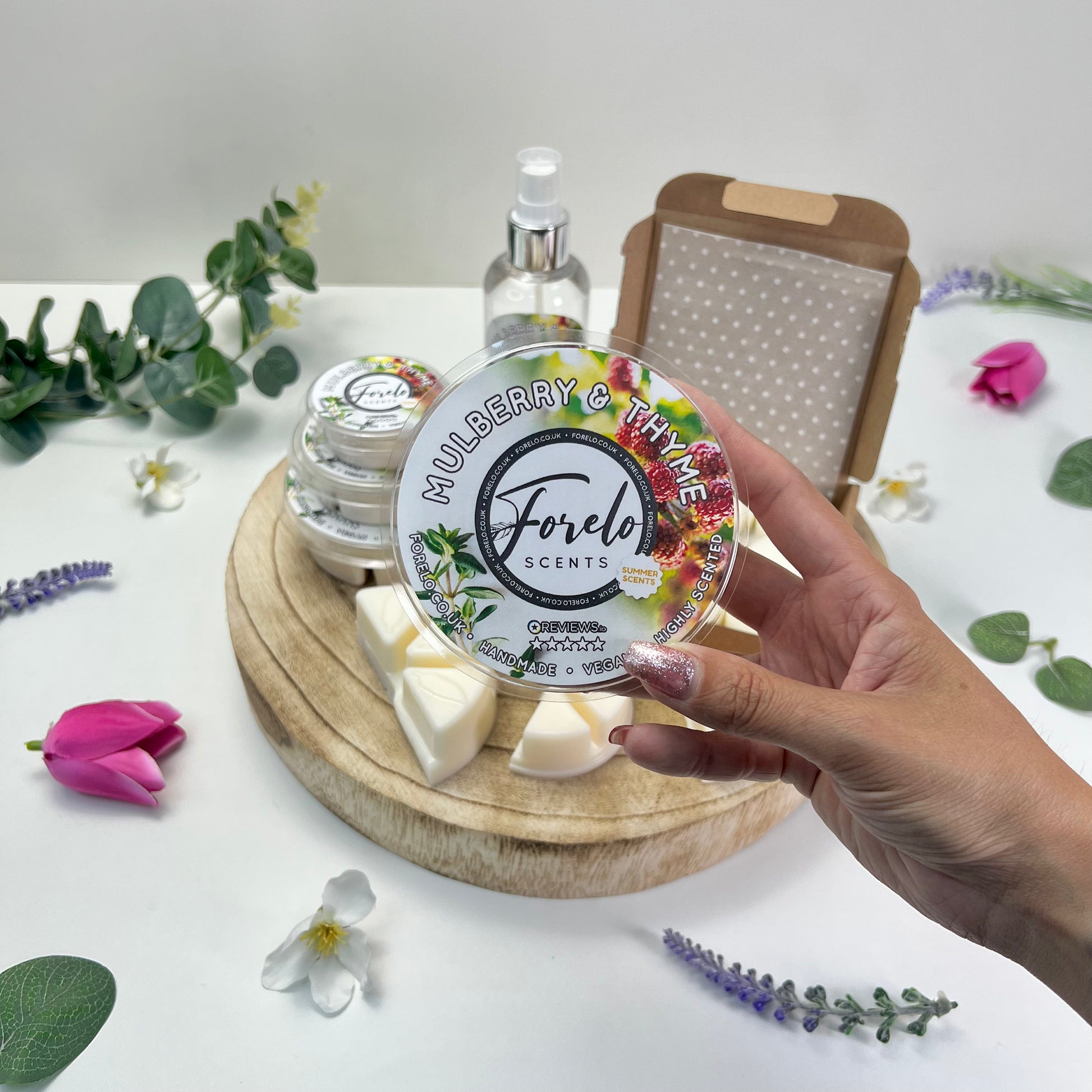 Mulberry & Thyme - A fresh floral accord with notes of mulberry & green tea. Followed by rosemary, mimosa & white jasmine, whilst resting on a background of musk & amber.